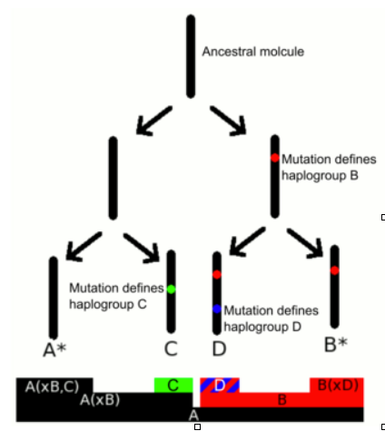 There are some haplogroups which are transmitted only in male or female lines; the male Y haplo and the female mt haplo. This reveals much about how recrossing occurred.